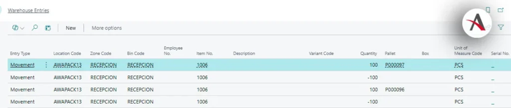 Cuando los artículos están configurados para trabajar por palets en Business Central, el sistema puede asignarlos automáticamente durante los procesos de recepción. Esto permite que la mercancía se divida de forma clara y coherente según la realidad física del almacén.