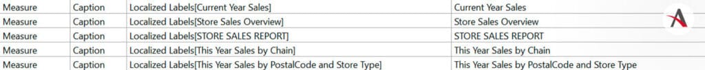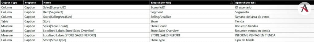 Si observásemos todas las filas existentes, podríamos ver que existe una por cada nombre de tabla, medida, y columna del modelo que no esté oculta. ¡Pero esto no se queda aquí! Nosotros podemos añadir, además, una tabla de etiquetas localizadas, que, como se mostraba en la imagen de las posibles traducciones, nos permitirá traducir títulos concretos de gráficos, de páginas…