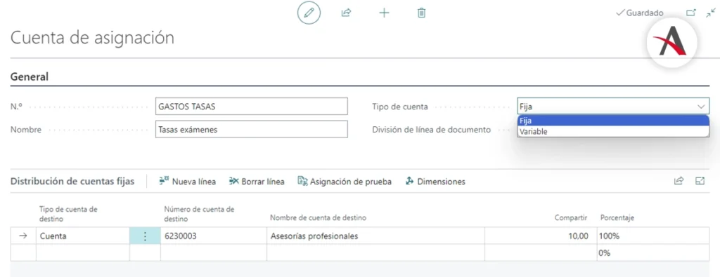 Para la cuenta fija, se refiere a aplicar siempre un mismo porcentaje, como su nombre lo indica. En cuanto al tipo de cuenta variable, hace referencia a un cálculo que puede cambiar por fechas, por ejemplo (no es igual distribuir gastos de empleados entre 10 que entre 30, dependiendo de altas o bajas), es decir, es un valor que variará dependiendo de otros factores.