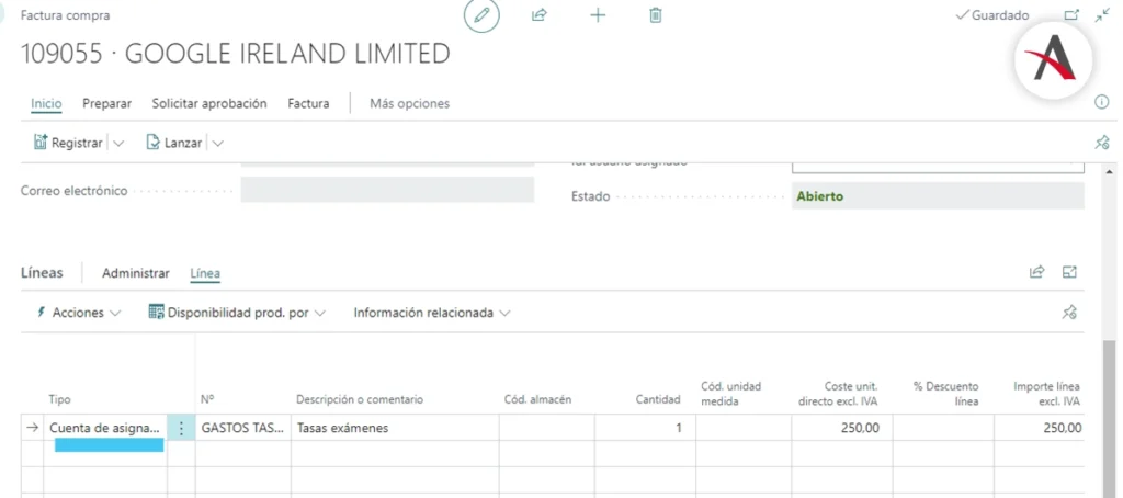 Después de esto, hay que ingresarlo a través de una factura de compra. Por ejemplo: al completar la información en la sección de ‘Líneas’, hay que elegir el tipo de línea “cuenta de asignación”.