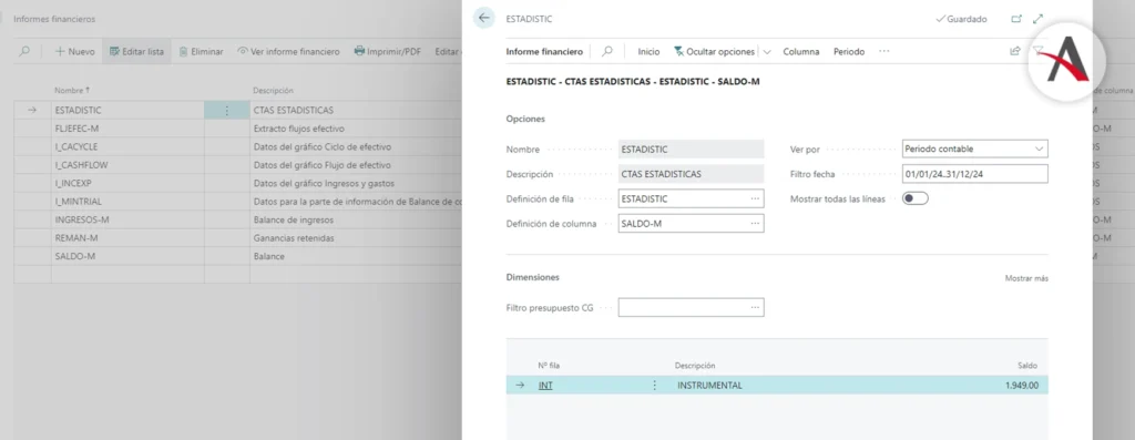 Podemos utilizar y confeccionar «Informes Financieros» solo para movimientos de cuentas estadísticas o combinar líneas de cuentas estadísticas con el resto de nuestros informes que utilizan líneas de cuentas contables.