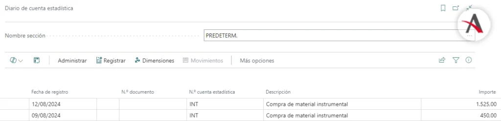 Para el registro de movimientos de cuentas estadísticas, o bien utilizamos el buscador general o desde la misma ficha de la cuenta estadística podemos acceder a ‘Diario de cuentas estadísticas’.