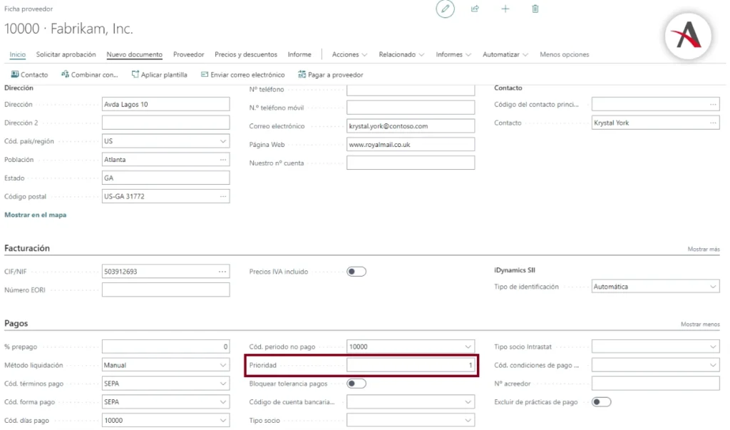 Microsoft Dynamics 365 Business Central permite asignar prioridades a los proveedores para proponer los pagos. Además, se considera que el número más bajo de prioridad, excepto el 0, tiene la prioridad más alta. Por ejemplo, si se utiliza 1, 2 y 3, 1 tendrá la prioridad más alta: