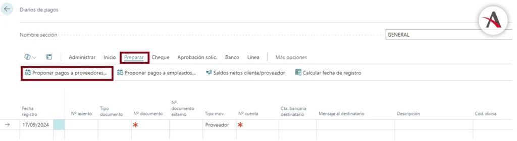 Tipo contrapartida: especifica el tipo de contrapartida que se quiere utilizar en el asiento de pago. Si la sección desde la que estamos ejecutando la acción de ‘Proponer pagos a proveedores’ tiene un tipo de Contrapartida asignado, el tipo contrapartida lo establece el sistema: