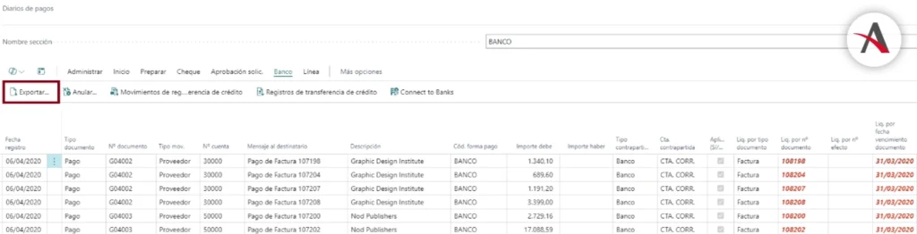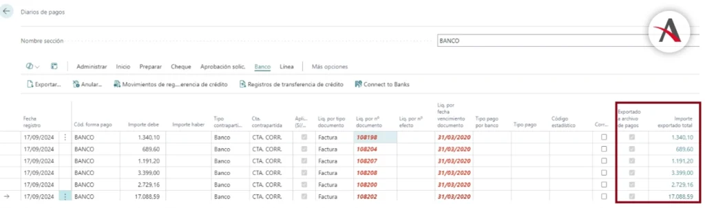 - Exportado a archivo de pagos: marca de verificación que el sistema marca automáticamente cuando se exporta el fichero.