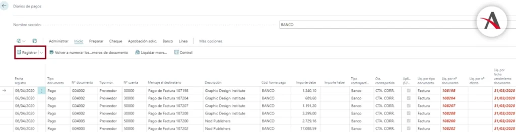 Cuando se tiene la confirmación del banco de que los pagos se han realizado, se registra el diario de pagos en Business Central: