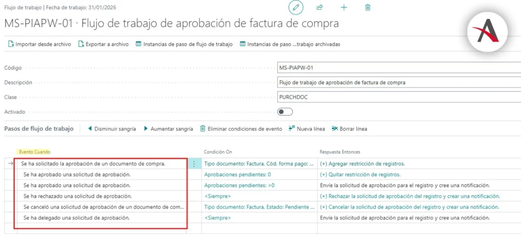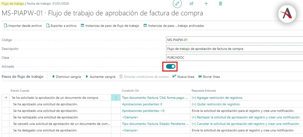 Luego de completar la configuración del flujo de aprobación también explicada en el punto anterior, se activa el flujo de trabajo: