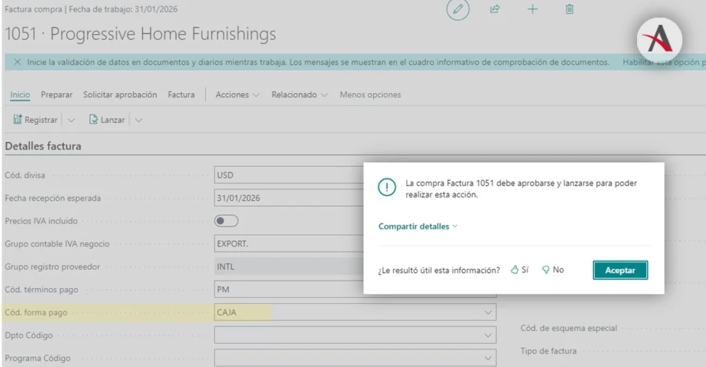 De esta manera, cuando se procede a registrar la factura de compra con un ‘Cód. forma pago’ diferente a BANCO, salta la siguiente ventana emergente mostrando el mensaje de que la factura debe aprobarse.