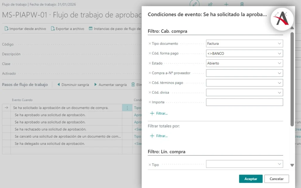 Cuando un registro necesita ser aprobado por alguien de la empresa se debe enviar una solicitud de aprobación como parte de un flujo de trabajo. En este caso práctico, se crea un flujo de trabajo para aprobar un documento de factura de compra con las siguientes especificaciones: