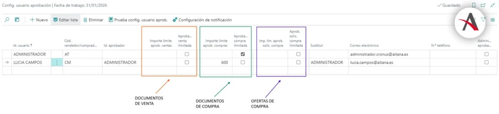 En la siguiente imagen se han configurado, a modo de ejemplo, los usuarios para flujos de aprobación de documentos de compra.