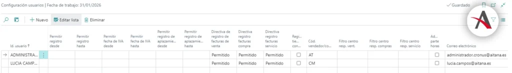 Los usuarios obligatoriamente también deben estar configurados en el punto de menú ‘Configuración usuarios’.