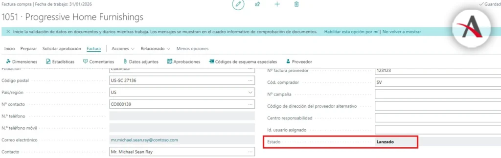 Una vez que todos los movimientos de aprobación creados han sido aprobados, el sistema actualiza automáticamente el estado de la factura a Lanzado. Este cambio demuestra que la factura ha pasado todas las validaciones requeridas y se puede proceder a su registro.