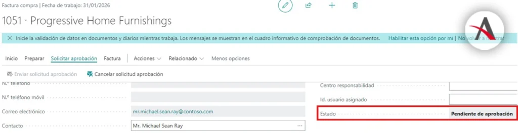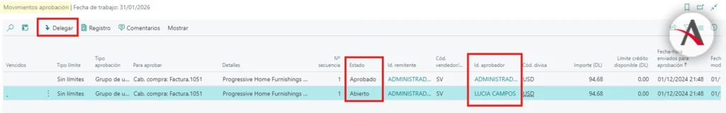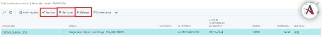 Tras esta acción, se han generado los movimientos de solicitud de aprobación correspondientes y el estado de la factura cambia a ‘Pendiente de aprobación’. No se permitirá su registro hasta que todos los aprobadores hayan aprobado. Con la acción delegar puede delegar solicitudes de aprobación abiertas al aprobador sustituto.
