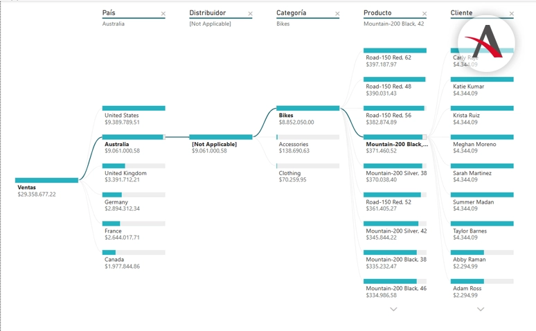 - Decomposition Tree: desglose dinámico de variables para entender el impacto de cada componente.