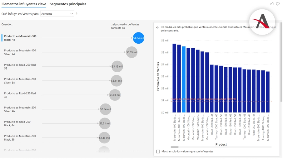 - Key Influencers: identificación de los factores que más influyen en un KPI.